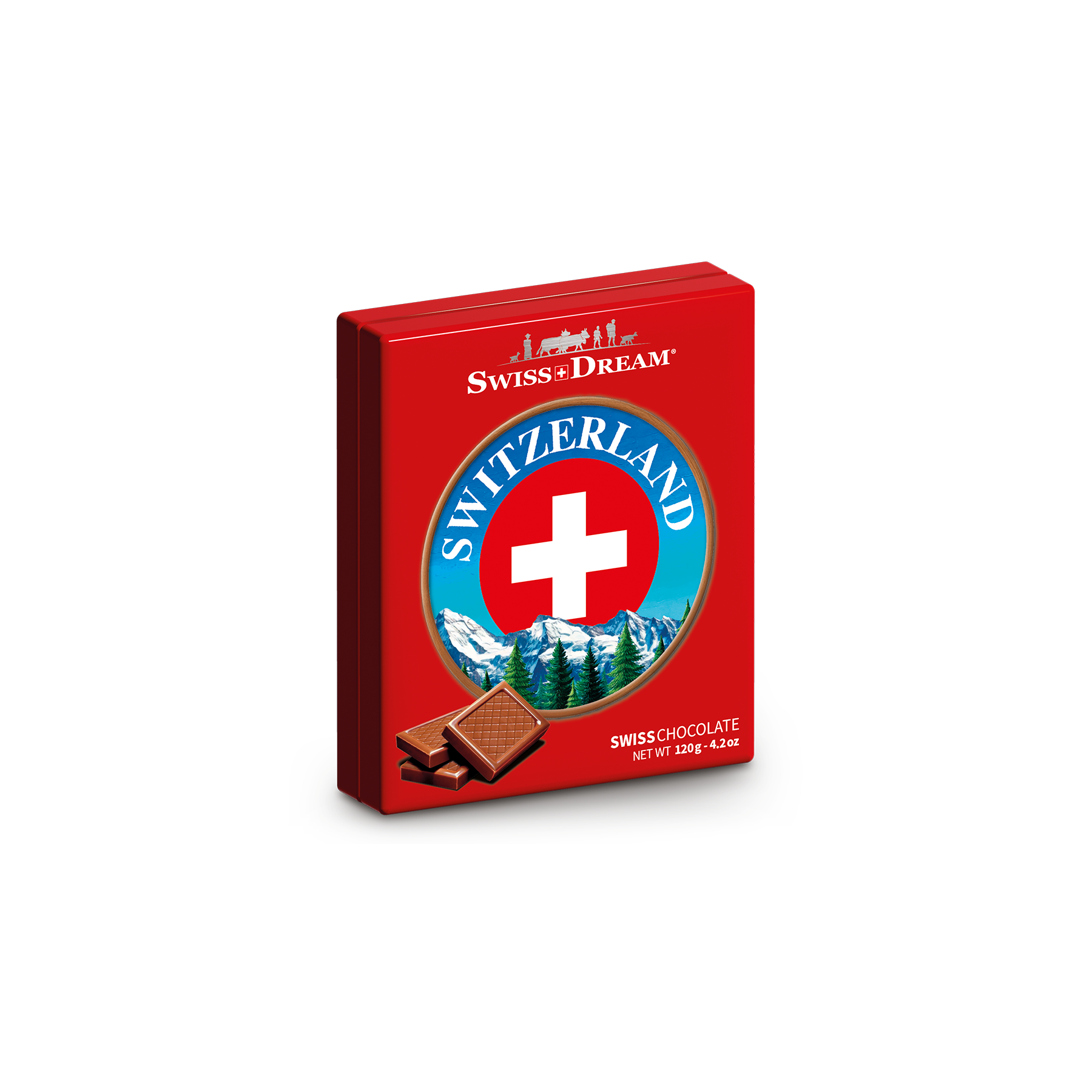 Garnie d’un assortiment de Napolitains suisses en édition hivernale (lait, lait-noisettes, noir et praliné), elle arbore fièrement le drapeau suisse dans un décor alpin vintage.