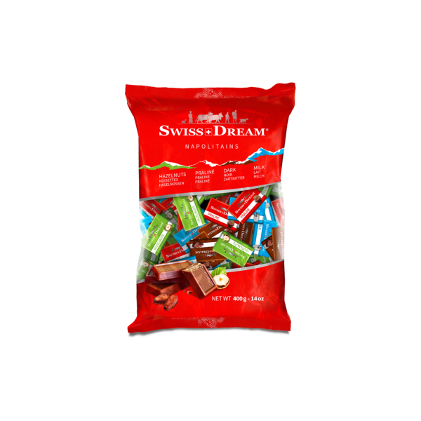 Assortiment de Napolitains suisses. Chaque chocolat offre une saveur unique : chocolat au lait, noir, noisettes et praliné. Idéal pour une pause gourmande ou comme souvenir à offrir.